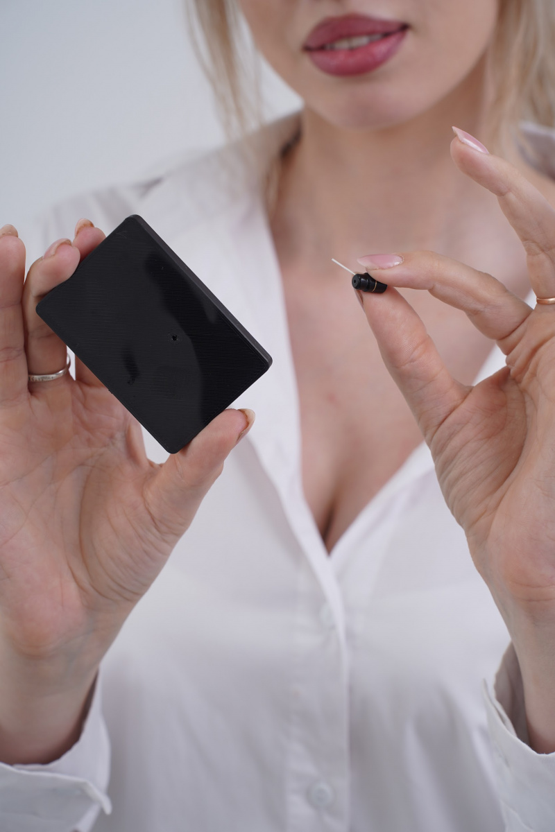 - Максимальная скрытность. Сама гарнитура имеет небольшие размеры и выглядит как обычная банковская карта, которую легко можно спрятать в любой карман или портмоне. Микрофон очень хороший, он может улавливать даже шепот с большого расстояния;